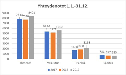 FINEen tuli vuoden 2019 aikana 8 400 asiakasyhteydenottoa. Yhteydenottojen määrä ja erityisesti henkilökohtaisen puhelinneuvonnan tarve kasvoivat. Eniten yhteydenottoja tuli vakuutusasioissa, joita oli 5600. Pankkiasioissa yhteydenottojen määrä oli 2200 ja sijoitusasioissa 600. Toiminnastamme on lähes 90 % neuvontaa ja loput noin 10 % asiakkaiden ja palvelunrajojaien välisten riitojen ratkaisua.